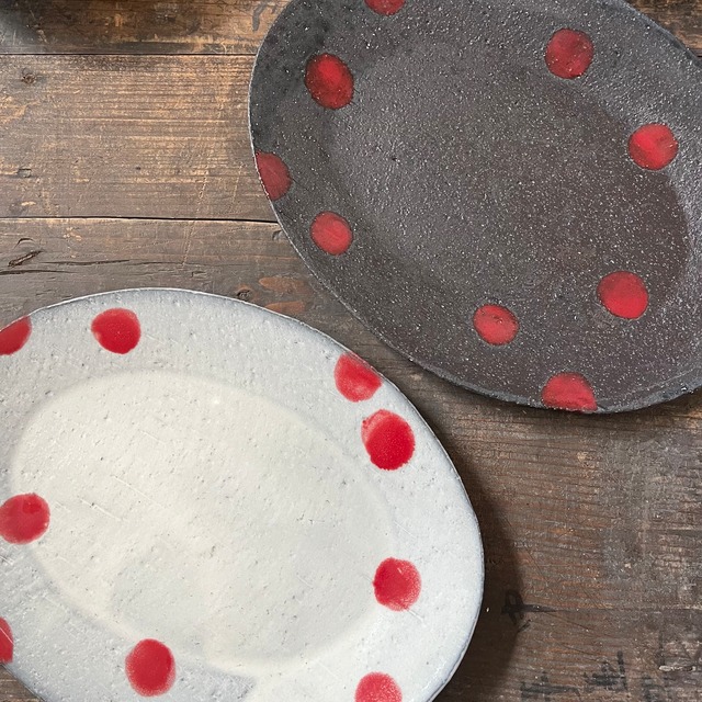 白黒共に 約23×17.5cm 高さ約1.5cm ケーキ皿としてはもちろん、取り皿等にも幅広くお使いいただけます 別売りの赤ドットカップと合わせると ケーキの置けるコーヒーセットになります ※陶器の色や質感は、写真と実物とは異なって見える場合があります。 ※全て手作りですので、ひとつひとつ形や色合い、表情が異なります。 特に陶器は釉薬の重なり、流れ、溜まり、窯による歪み等が見られる場合があります。 また土は吸収性が高く、使っていく内に色合いが変わっていくことがありますが陶器は育てるものと捉えて頂き、景色としてお楽しみください。 ※使用後は必ずよく乾燥させてから収納ください。匂いや茶渋がついてしまった場合は、重曹水に半日から一日つけてから乾燥させると、臭いがとれることがあります
